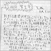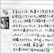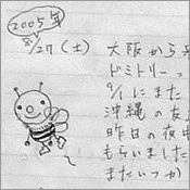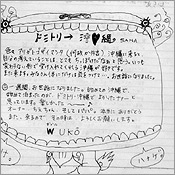 2004 第1号。まるまる1週間お世話になりました。みなさん本当にやさしくって、すんごく楽しかったです。この宿にとまって色々な体験もできました。経験豊富な大人のみなさん、お話いっぱい聞かせてくれてありがとうございました。しまさん、おいしいおいしい沖縄手料理作ってくれてありがとうございました!ホントにおいしかった。また食べたいなぁ〜。城間さん、お世話になりました。またお世話になることがあることがあると思いますが、よろしくお願いします。みなさんお仕事がんばって下さいネ!ありがとうございました!でわ、明日から宮古に行ってきま〜す。