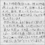 色々アリガトウゴザイマシタ(何故か片言)。沖縄に来ると、自分の考えているkとおは、とてもちっぽけだなぁと思う。いつも変わらない形で受け入れてくれる沖縄が好きです。また来ます。みなさん体にだけは気をつけて…。お世話になりました。